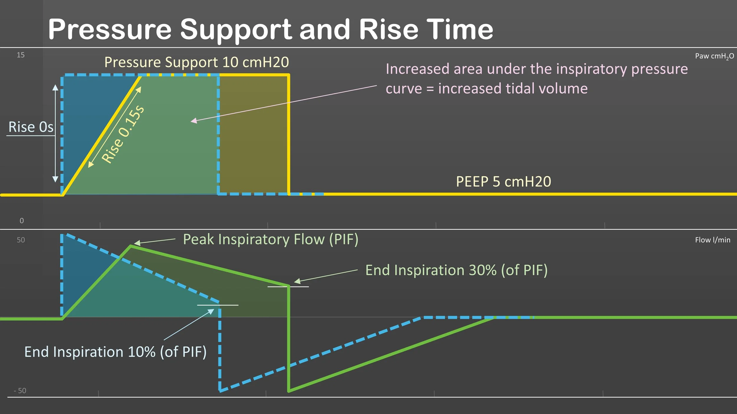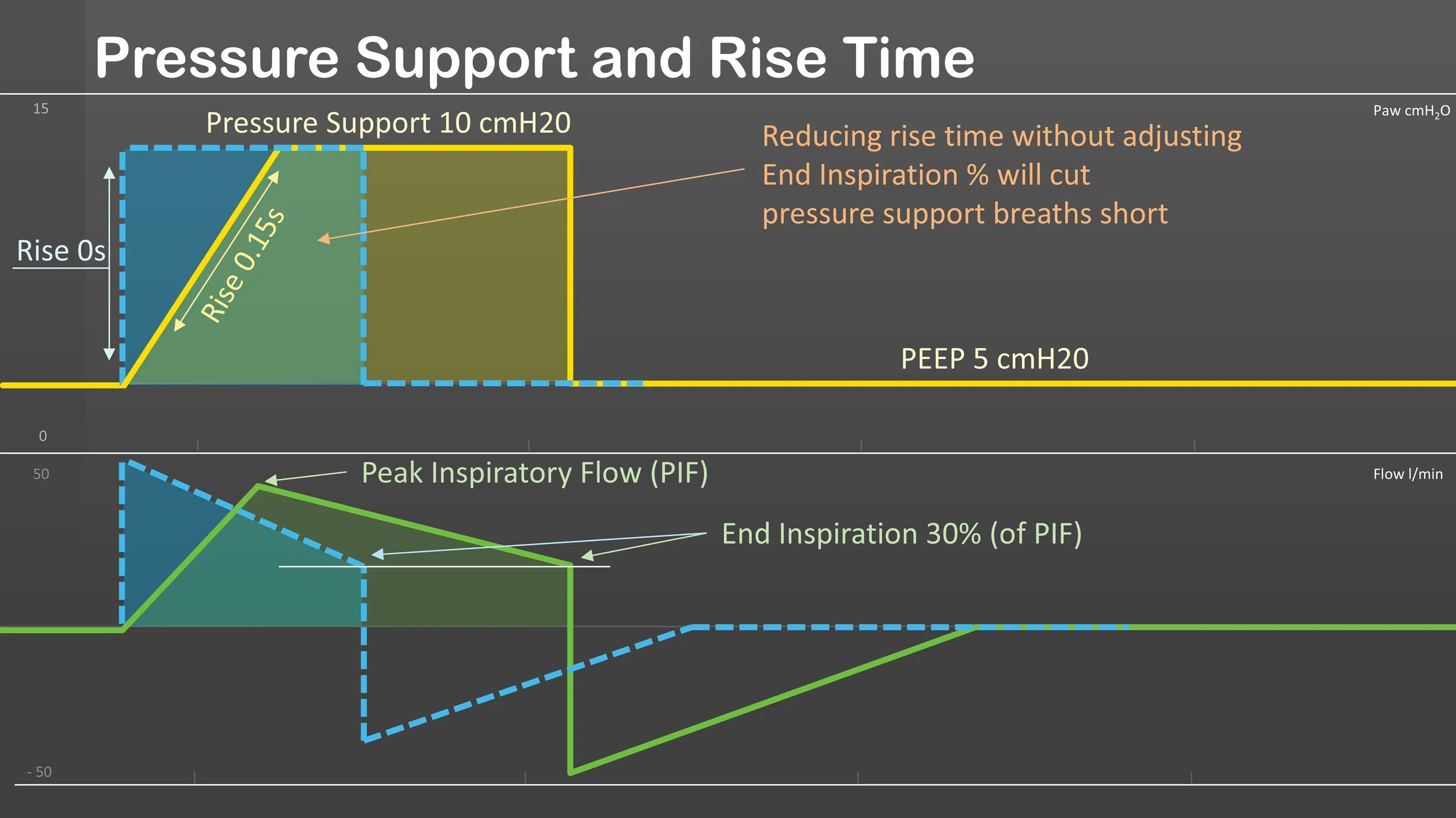 Rise time is a valuable tool for improving patient synchrony during mechanical ventilation. However, it’s important to remember that on many ventilators, the rise time setting affects both control and pressure support breaths. This becomes especially relevant in modes that combine SIMV and pressure support.